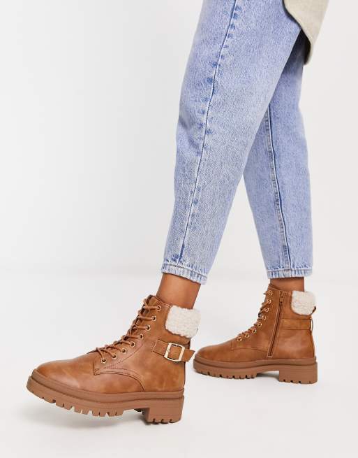 New Look lace up utility boot with shearling and buckle detail in tan Very well made.