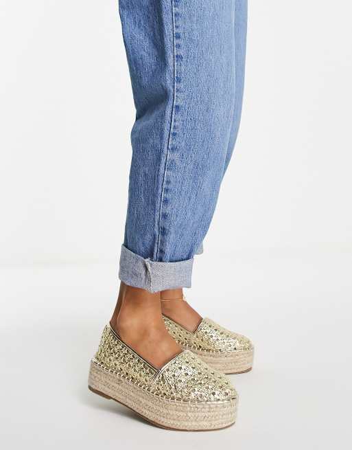 Alpargatas doradas con dise o entretejido puntera protectora y plataforma plana Jala de ASOS DESIGN Very well made.