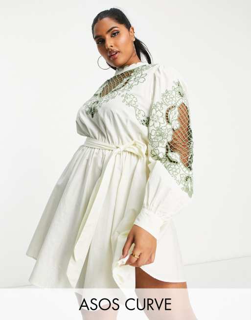 ASOS DESIGN Curve high neck cutwork belted mini dress in stone with green detail Very well made.